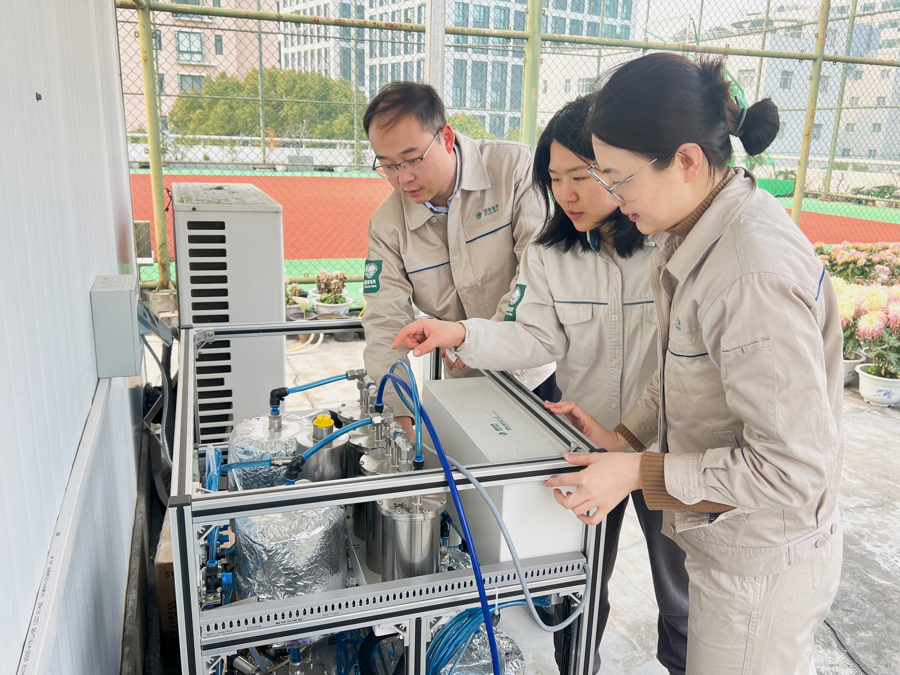 国网上海电科院电碳协同攻关团队成员对研发的直接空气碳捕集装置进行检测