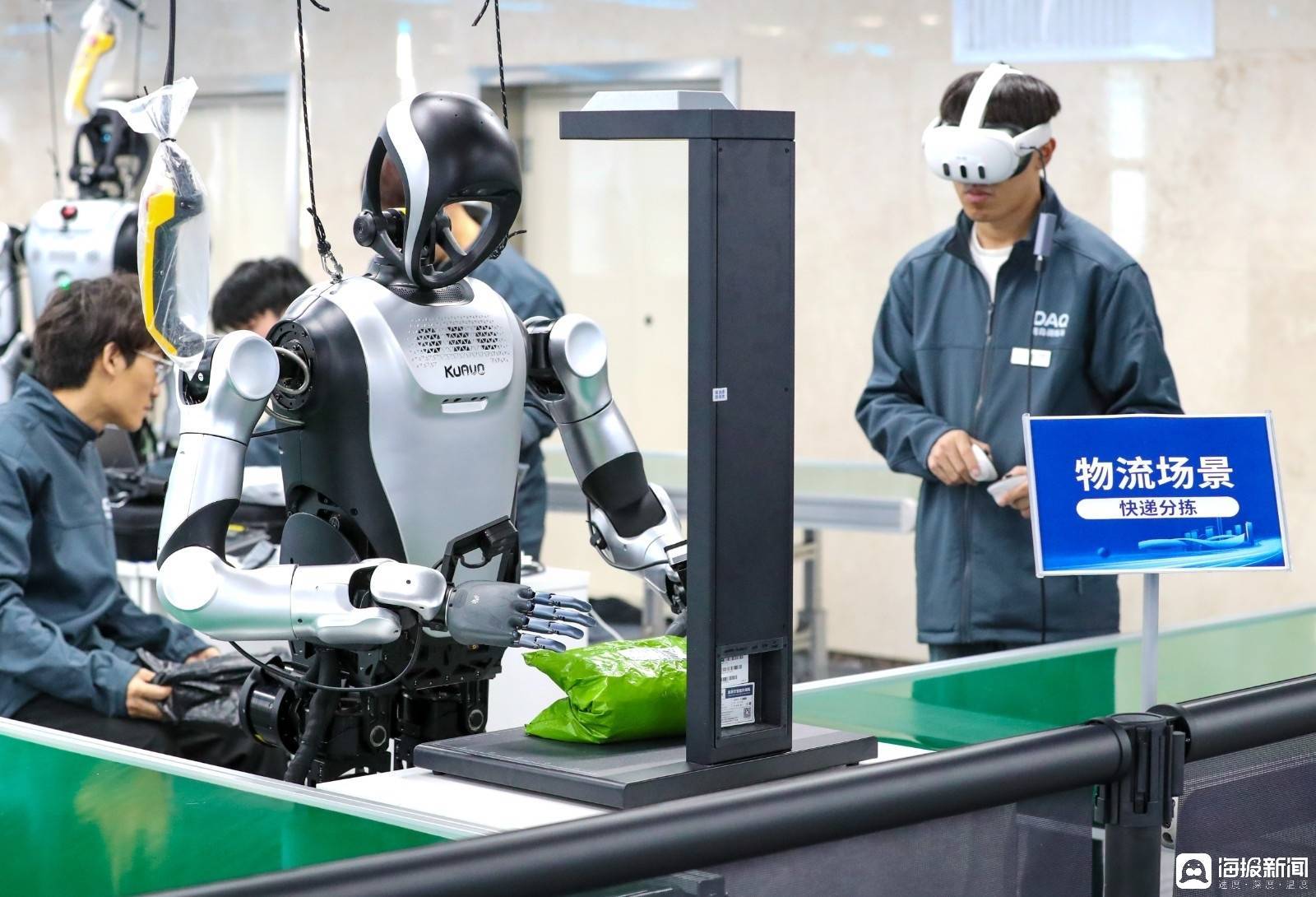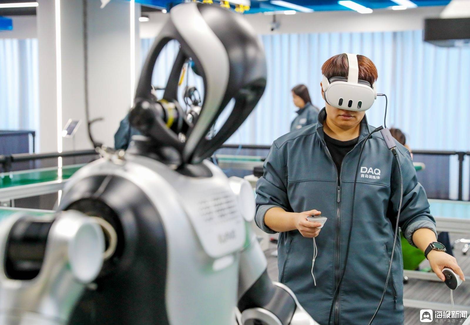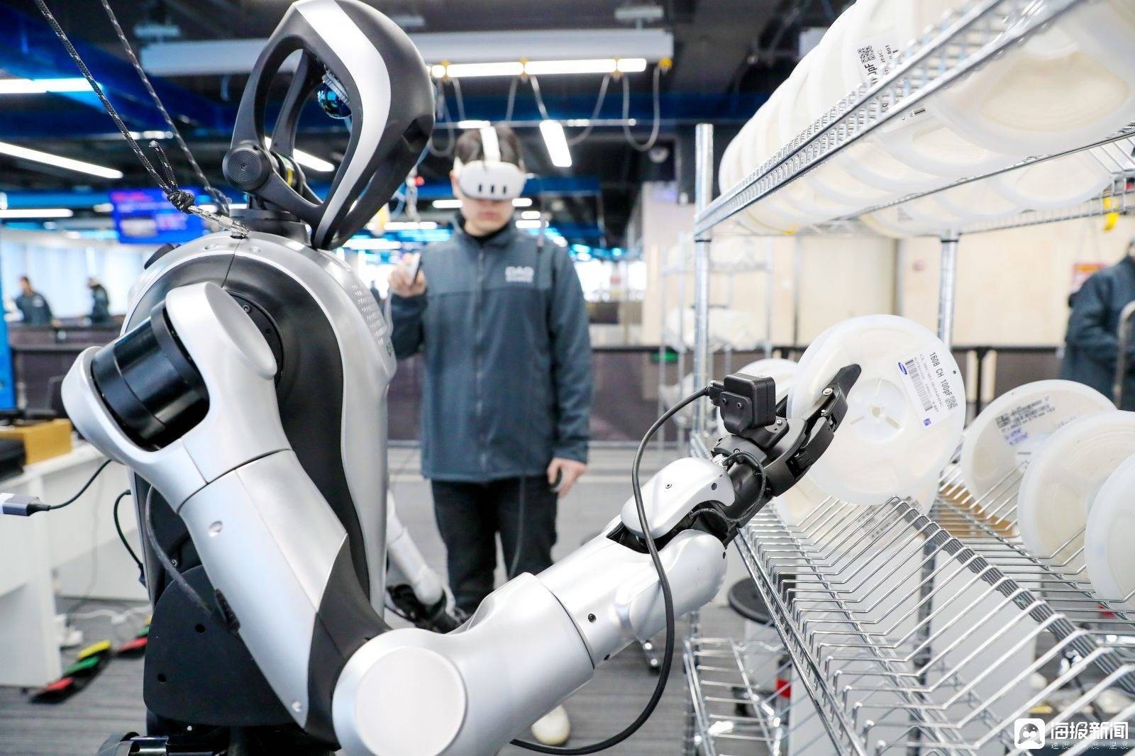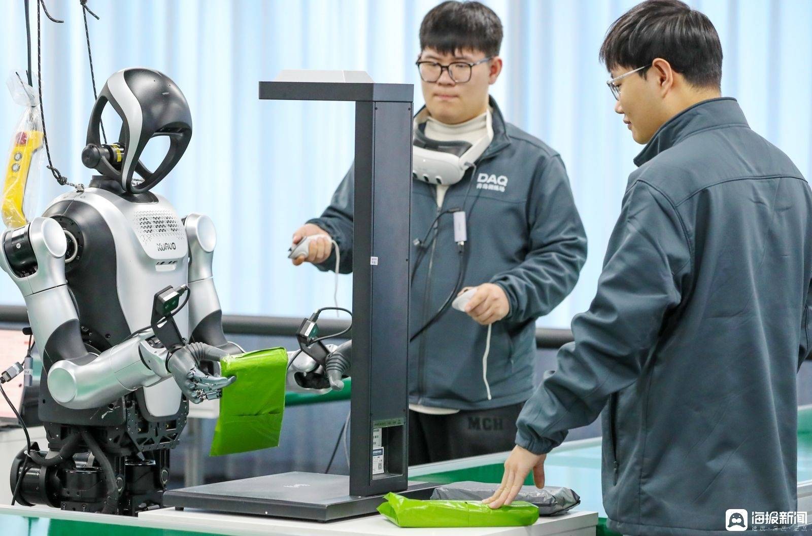 r1月12日,在青岛市人形机器人数据采集训练场,数据采集人员头戴VR设备、手持感应手柄,如“教师”般指导人形机器人学习抓取、搬运与分拣等精细化技能。眼前,人形机器人在流水线上“学快递分拣”,在货架前“学理货”…… 一幕幕“实训课”正生动进行。
